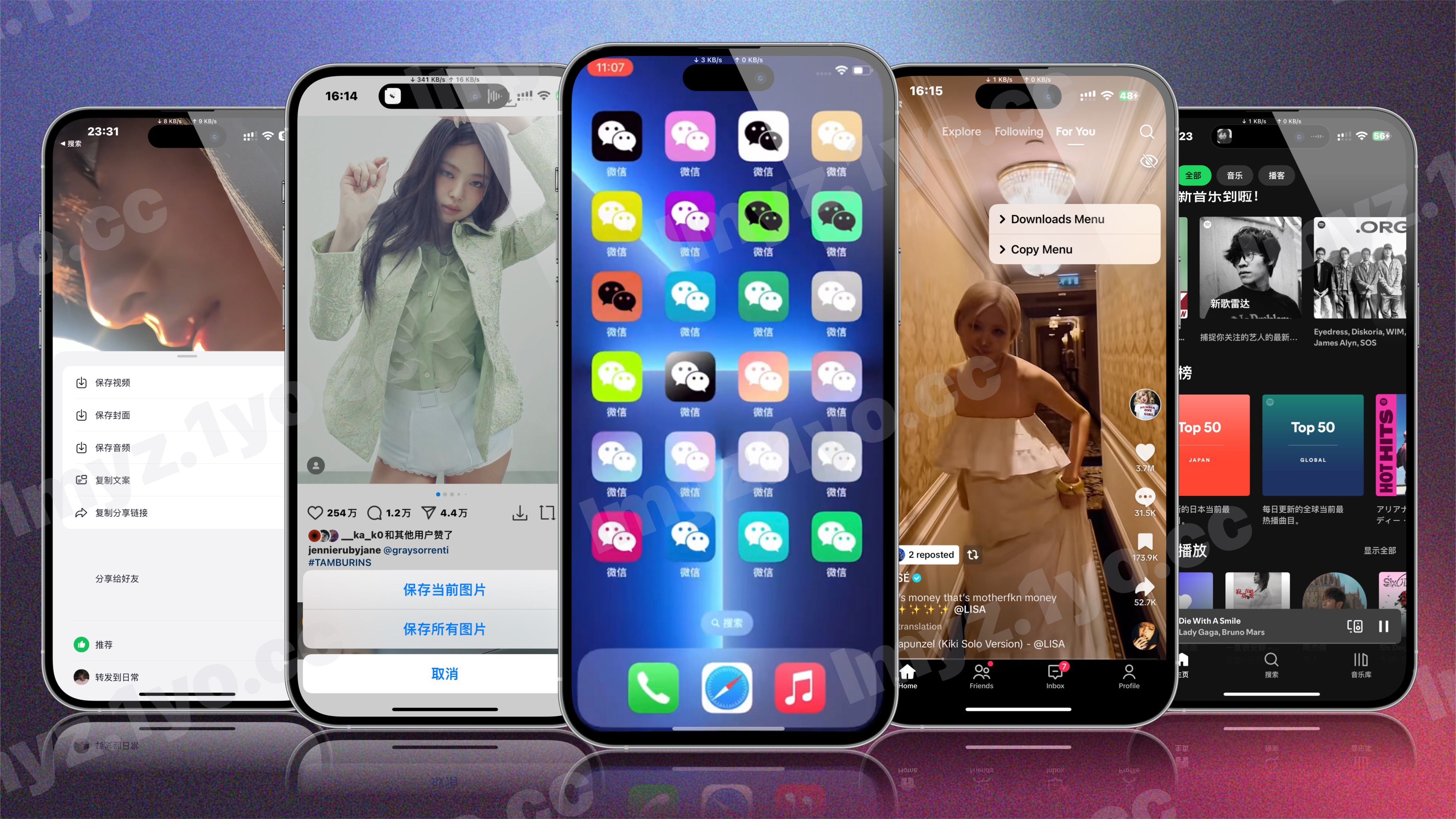 应用预览,按顺序依次是: Tiktok Youtube Youtube Music Spotify instagram X(twitter) 小红书 抖音...