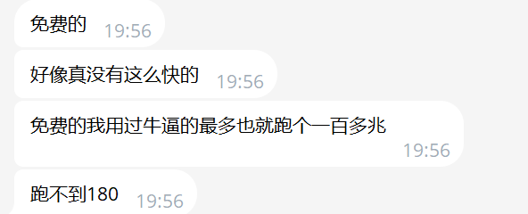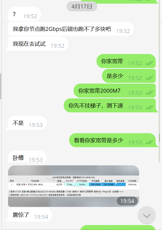 顺便说下现实生活中发生的真实的事儿,我给我线下朋友也可以说是我的同事,我看到他用的30块一个月100G,然后我说那我给你我的,免费用,速度100%比你那更快,他测了下速说了句的确,比他那个快爆了。