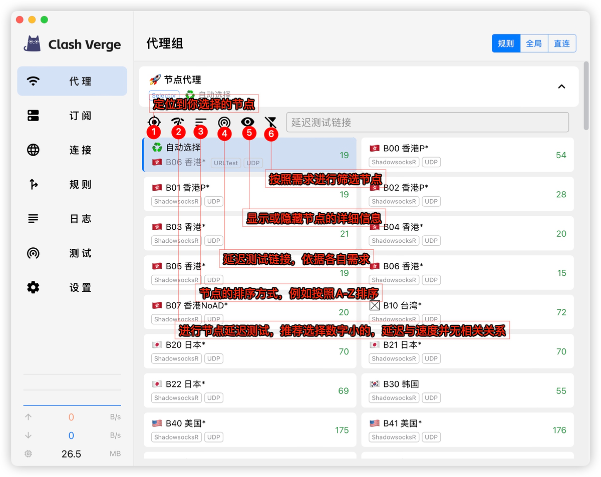 页面左侧选择【代理】,在下方页面策略组中选择你想要使用的节点。