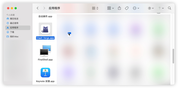 需要注意的是MacOS,个别情况,软件安装完成后,并不会在启动台里面显现clash verge图标,此时,需要打开访达,切换到应用程序,找到clash verge图标并打开。如下所示:
