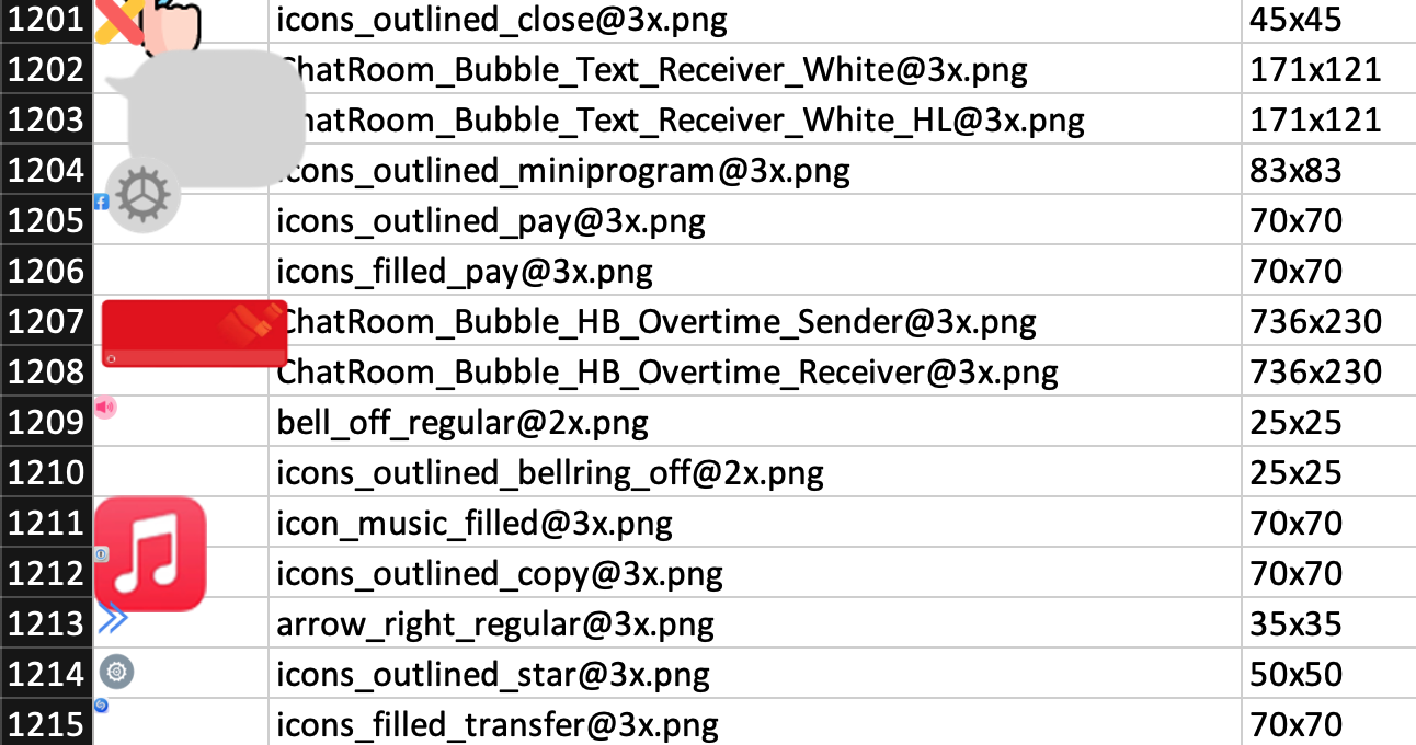 制作本主题时的辅助 Python 脚本文件。可快速提取官方 WeChat 包里经过解压后的 Assets 文件夹的所有文件的图标、文件名、尺寸大小,以及帮助你快速将他人的主题包里使用相同图标但命名不同的文件按照图标和文件名统一分类输出为 excel 表。