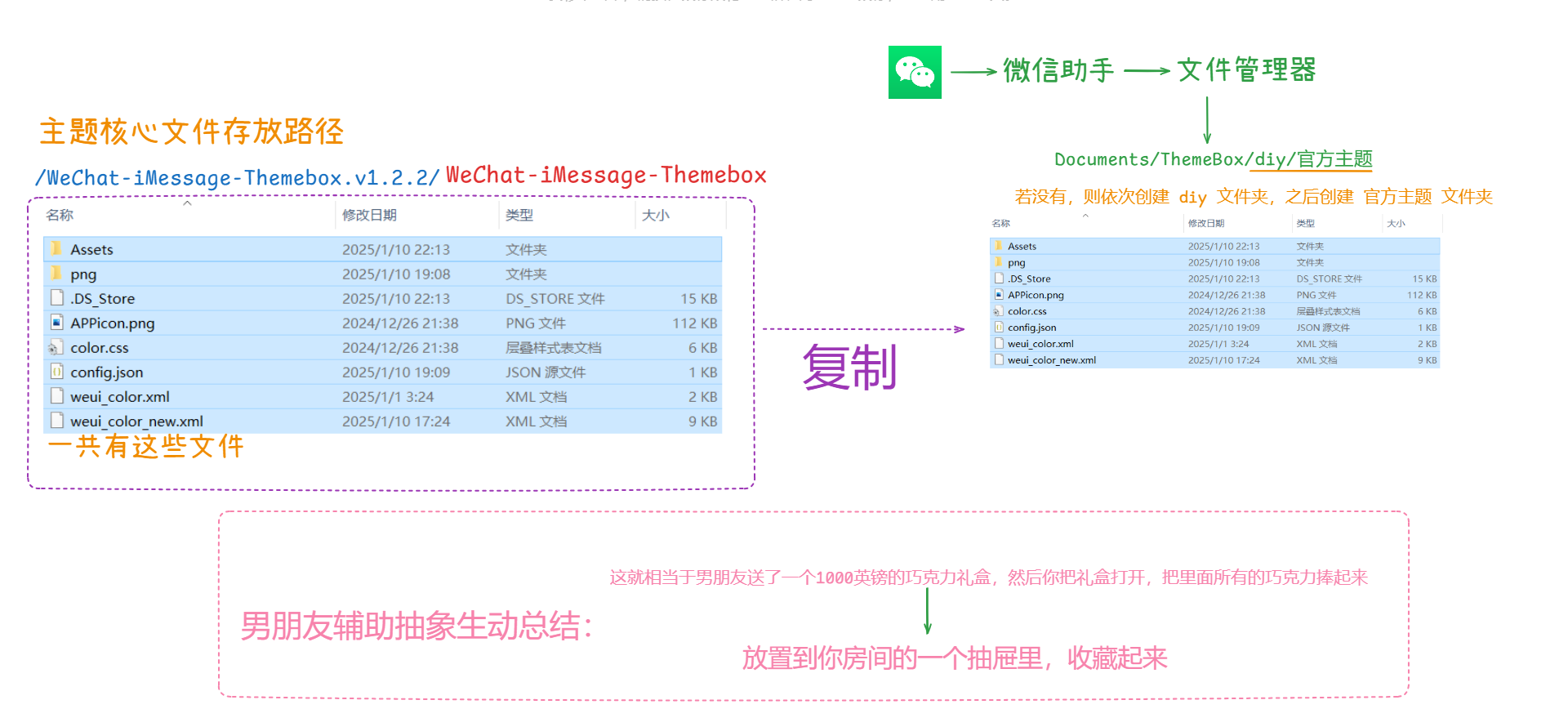 首先:去微信中的->微信助手插件->文件管理器->Documents/ThemeBox/diy/官方主题 中