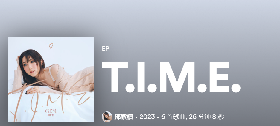 T.I.M.E. “This Is My Era,这就是我的时代。”她说。 G.E.M.邓紫棋 2023 焕新计划《T.I.M.E.》 这是她珍重的时光,也是她身处的时代。 《T.I.M.E.》EP收...